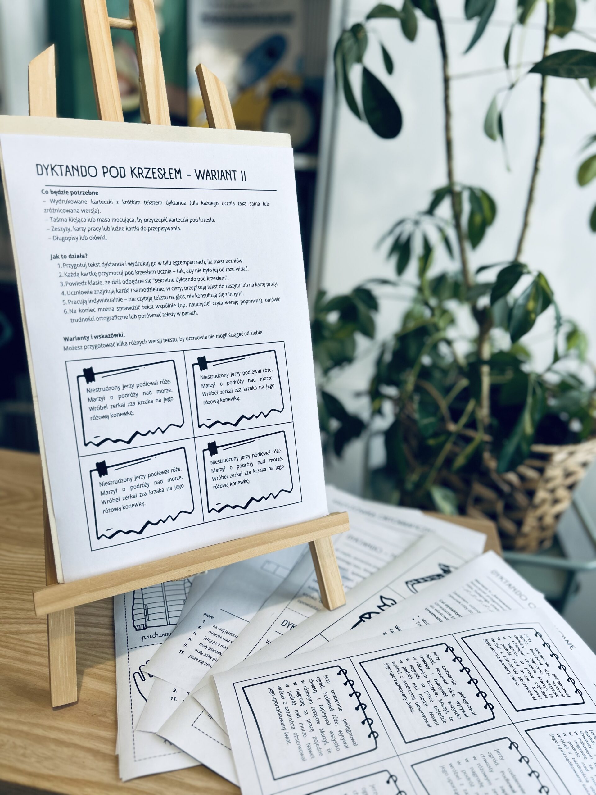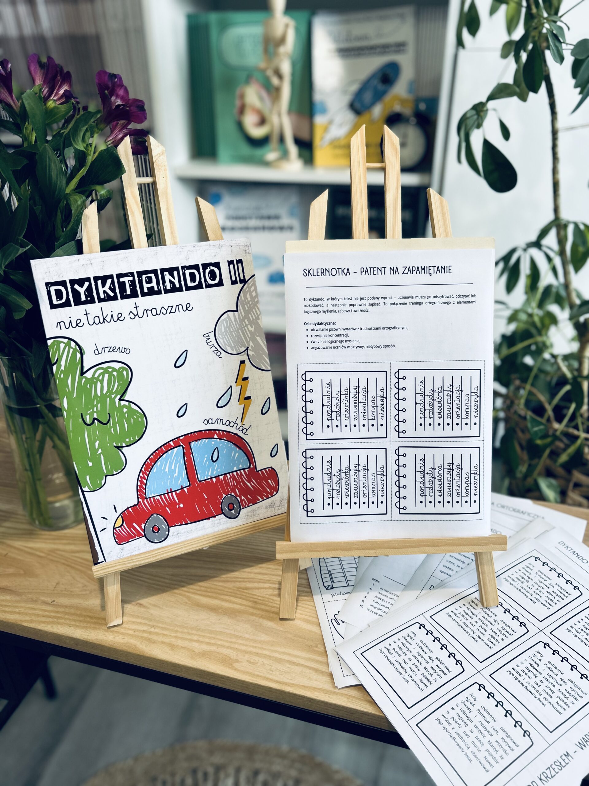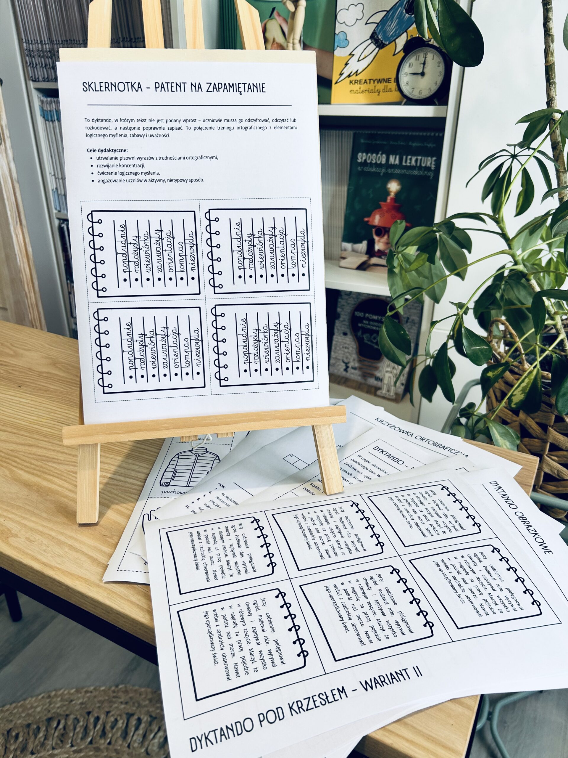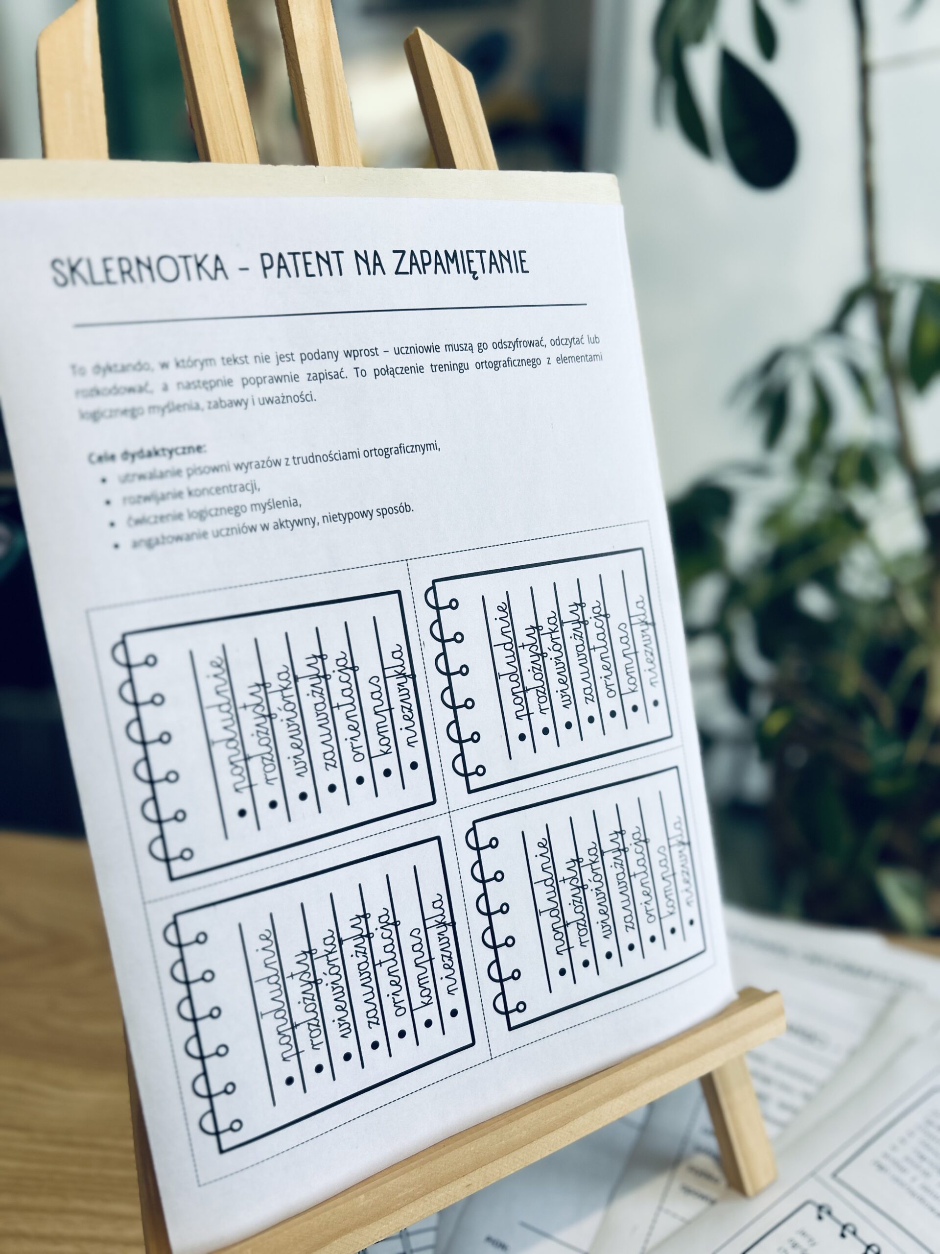 •  Sklernotki – karteczki z trudnymi słowami, które uczniowie losują i wykorzystują w swoich zdaniach lub mini-dyktandach i wiele innych…